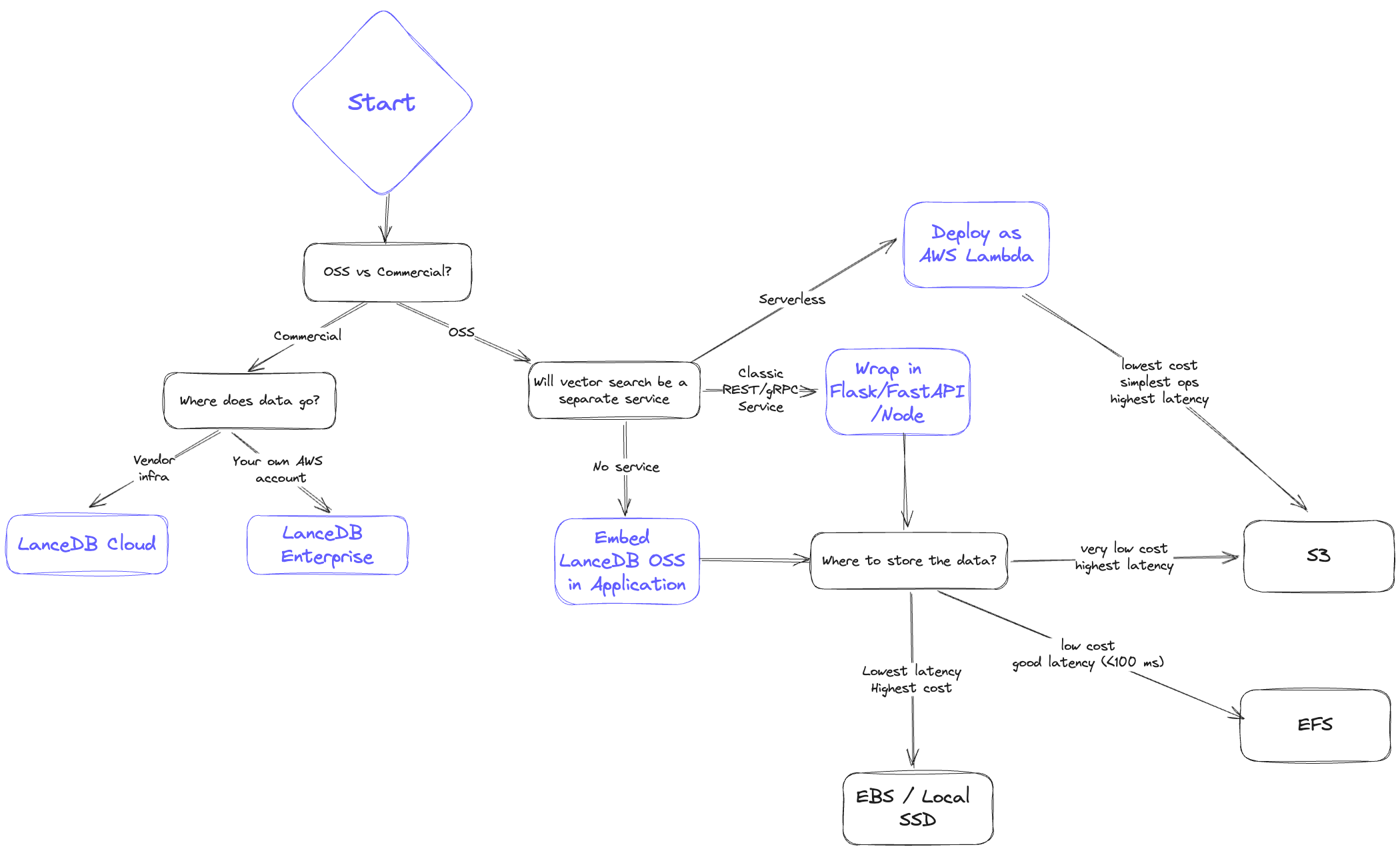We’ve prepared a simple diagram to showcase the thought process that goes into choosing a storage backend when using LanceDB OSS, Cloud or Enterprise.